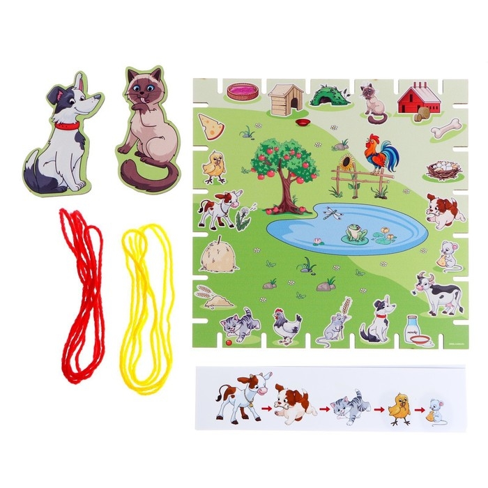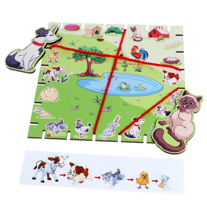 Геоборд — это специальная доска для конструирования различных изображений с помощью равноудалённых друг от друга штырьков и ниток. Малышу предстоит нанизывать нитку на штырьки, следуя последовательности из задания.