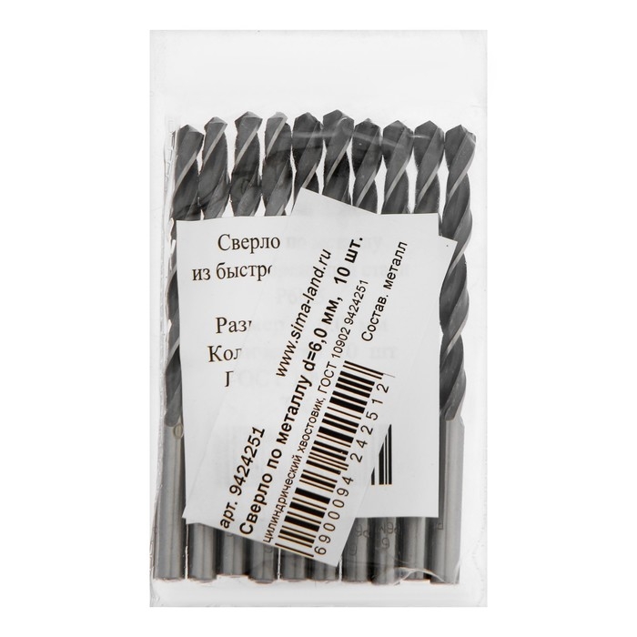 Сверло по металлу, d=6 мм, цилиндрический хвостовик, 10 шт., ГОСТ 10902