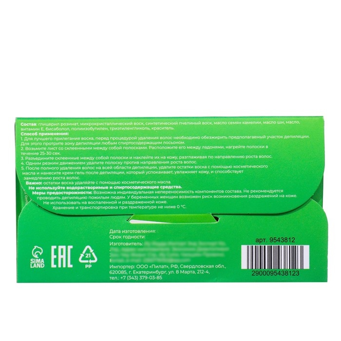 Меры предосторожности: Возможна индивидуальная непереносимость компонентов состава. Не рекомендуется проводить депиляцию пожилым людям. У беременных женщин возможен риск возникновения раздражений на коже. Не использовать на воспаленной и раздраженной коже.