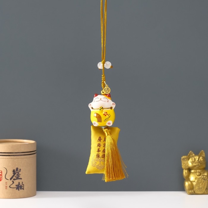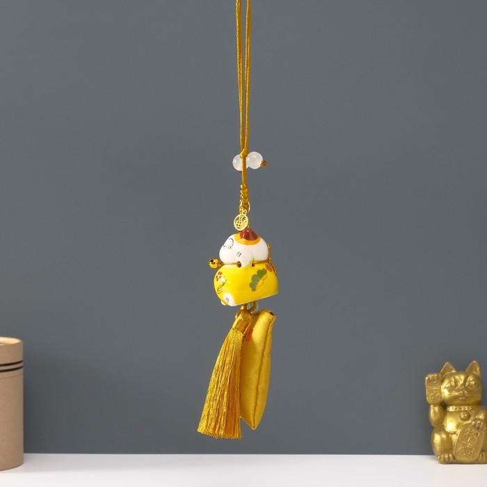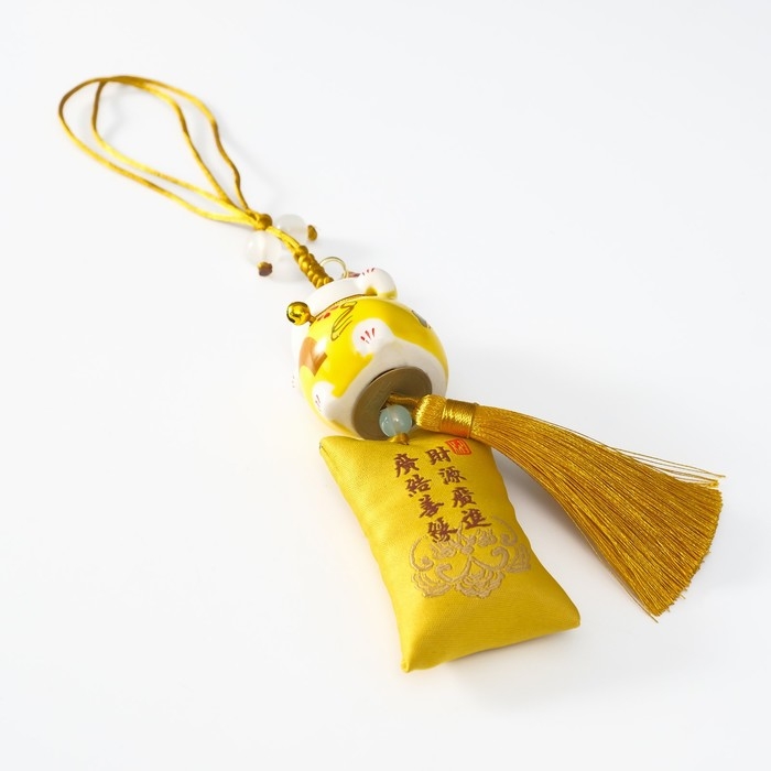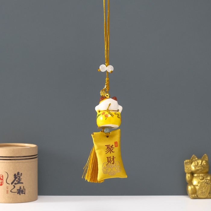 Подвеска керамика "Манэки-нэко с мешком удачи" жёлтый 3,8х4х25 см