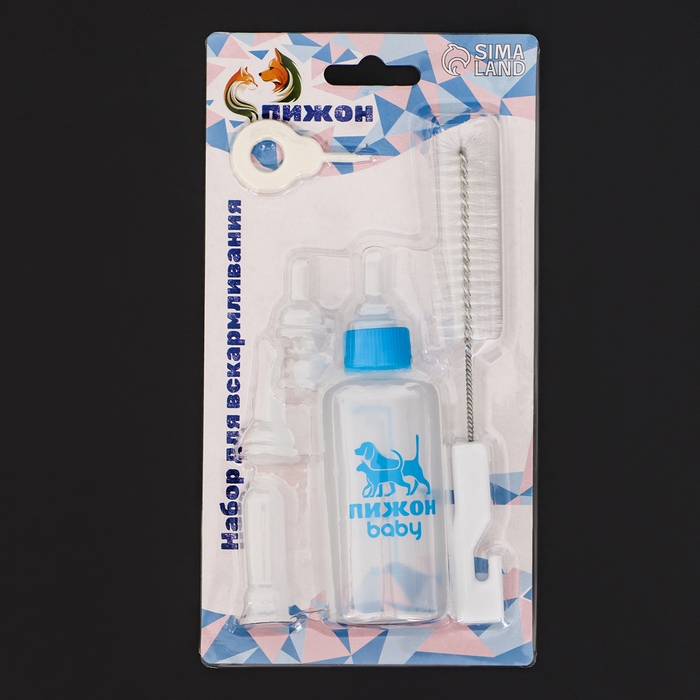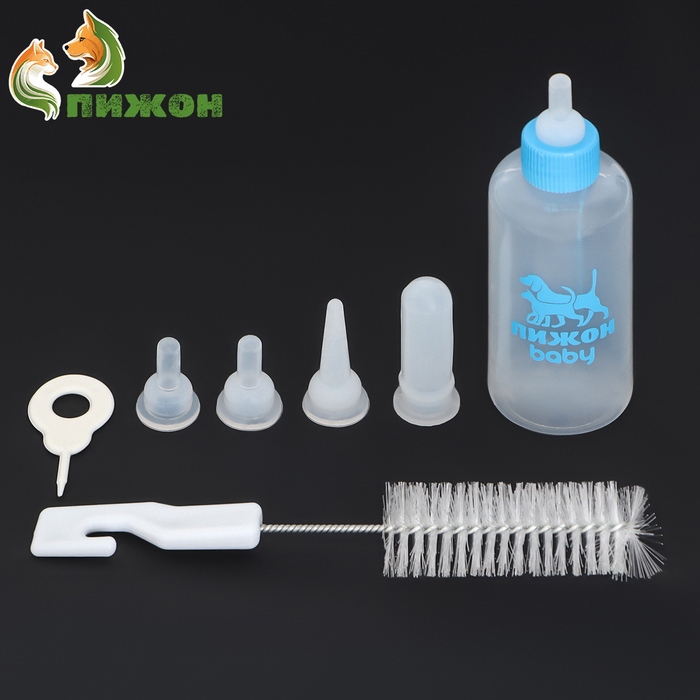 Набор для вскармливания щенков, котят и грызунов ПИЖОН. В комплекте содержится: 1 бутылочка объемом 60 мл, 4 соски, 2 короткие длиной 2 см, 1 длиная с тонким носиком 3 см, 1 длиная с толстым носиком 4 см, 1 ершик-щётка для мытья бутылочки. Показания к применению: для искусственного вскармливания новорожденных и подрастающих щенков, котят и других животных, а также для кормления больных и выздоравливающих животных. Способ применения: кончик резиновой соски проткните иглой или отрежьте верхушку ножницами. Будьте осторожны, потому что из-за слишком большого отверстия в соске животное может подавиться. После каждого использования, тщательно помойте бутылочку и соску.