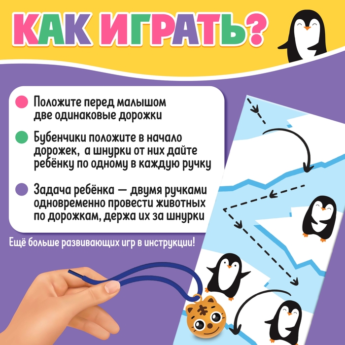 Внутри вы найдёте 6 дорожек для занятий, 2 бубенчика и шнурки в виде зверушек.
