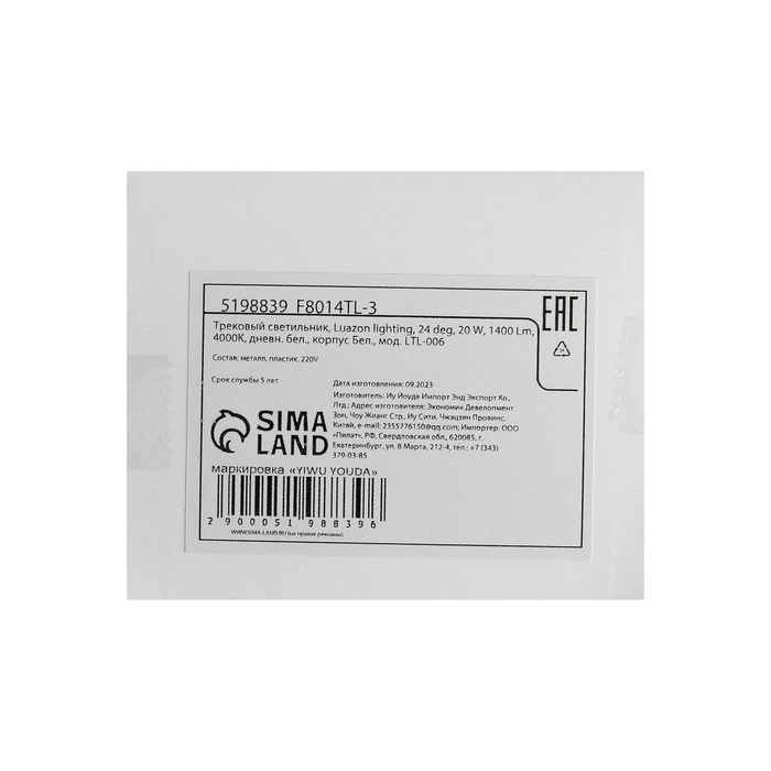 Трековый светильник, Luazon lighting, LTL-006,24 deg,20 W,1400 Lm,4000K, дневн.бел.корпус бел
