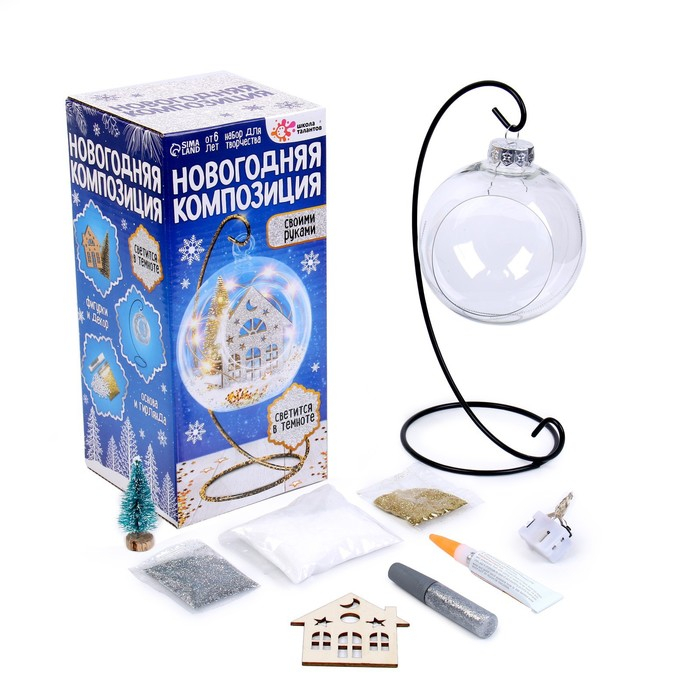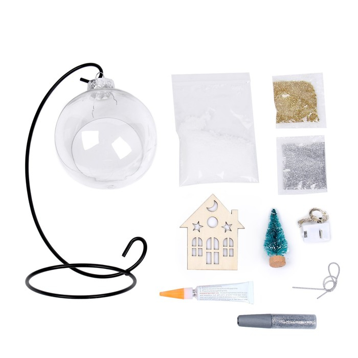 В наборе: металлическая подставка, шар-основа, деревянная фигурка, клей, двусторонняя клейкая лента, блёстки, декор, светящаяся гирлянда.