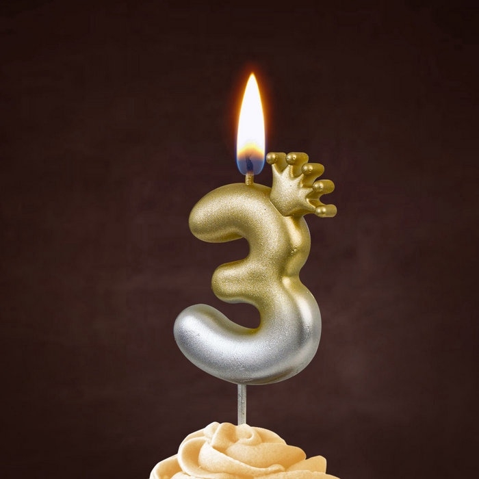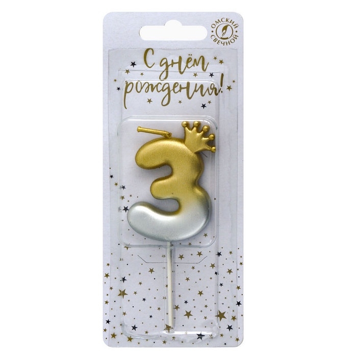 Свеча в торт «С короной», цифра 3, золото - серебро