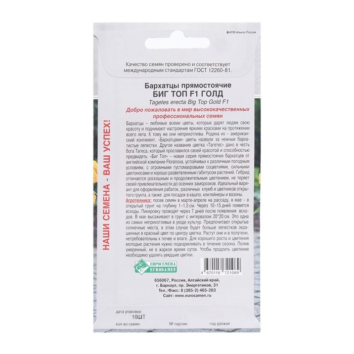 Семена Цветов Бархатцы прямостоячие Биг Топ F1 Голд, 10 шт