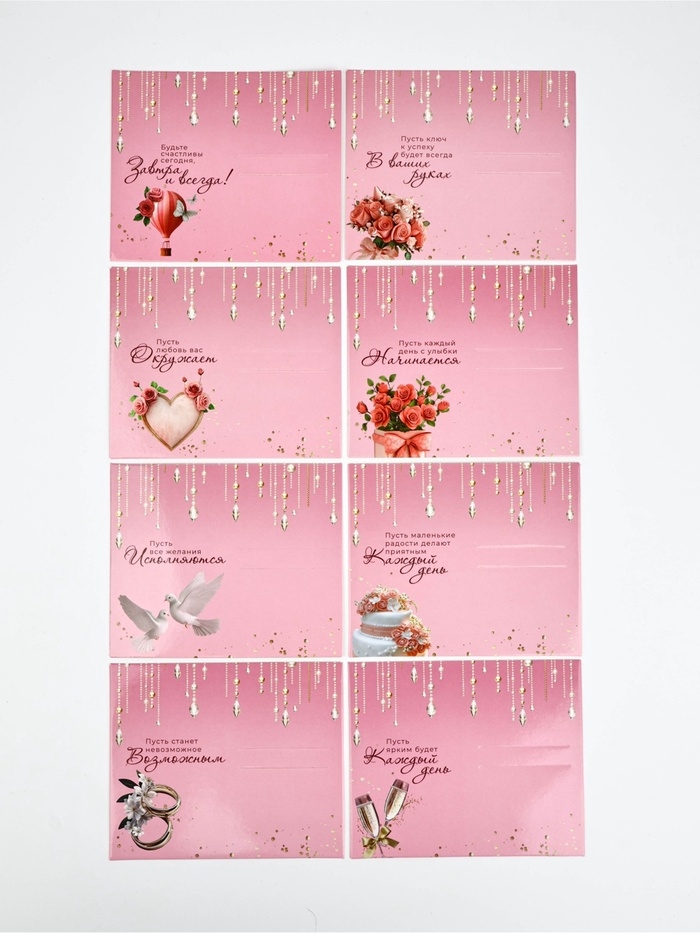 Коробочка пожеланий с местом для денег "С днём свадьбы", цветы, 8 карточек
