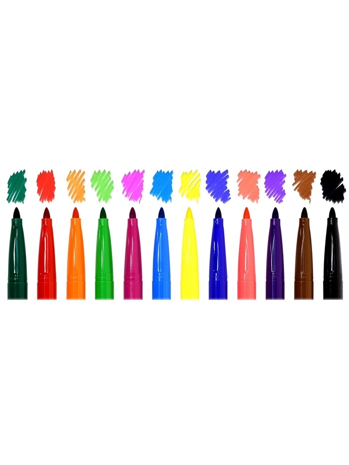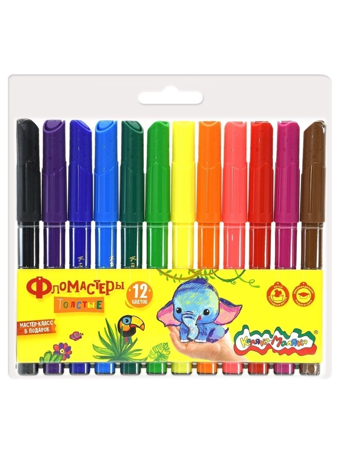 Фломастеры «Каляка-Маляка» (12 цветов) — насыщенные и легко смываемые, созданы для детского творчества. Утолщенный корпус удобно лежит в маленькой руке, а круглые колпачки защищают от высыхания.