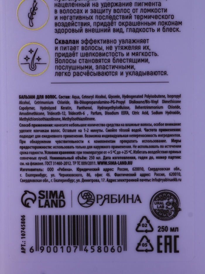 Профессиональный бальзам для окрашенных волос с активным комплексом и скваланом, 250 мл ULAB