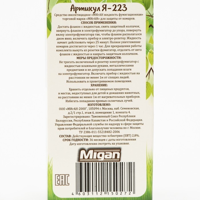 Меры предосторожности: не трогать включенный в розетку электрофумигатор влажными руками,