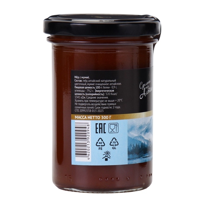 Мёд алтайский с мумие производится из натурального цветочного мёда, который смешивается с мумие - природным минеральным веществом, известным своими целебными свойствами. Мумие содержит множество полезных веществ, таких как аминокислоты, витамины, минералы и антиоксиданты.