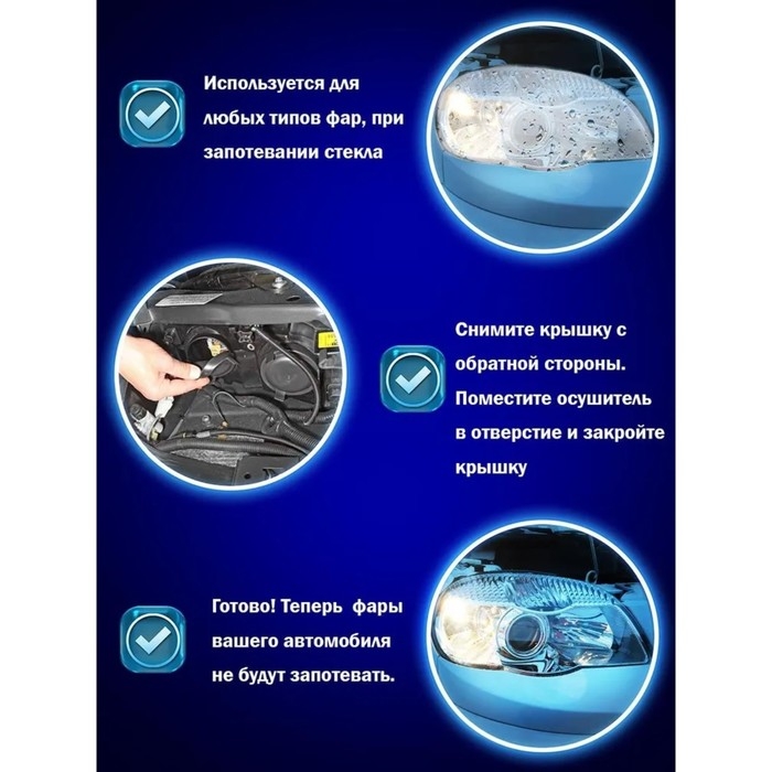 В некоторых случаях даже герметизация фары и открытие отверстий для выпуска воздуха не устраняют полностью запотевание фар. Популярный способ – использовать влагопоглотители для фар. Это небольшие пакетики с гранулами силикагеля , того самого препарата, который используется в автомобильном или домашнем осушителе. Влагопоглотитель осушитель для фар головного света автомобилей изготовлен из специального силикагеля с высокими абсорбирующими характеристиками. Применяется для предупреждения и устранения запотевания, возникшем из-за попадания влаги через технологические отверстия. Идеален при ретрофите, когда после установки LED модулей изменяется тепловой баланс фары и она потеет. Поглощает более 30% воды от собственного веса. Упаковка не рвется даже при неосторожном использовании.