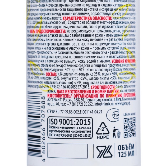 ОписаниеАэрозоль Дэта от комаров удобен в использовании при обработке поверхности большой площади и подходит для нанесения, как на открытые части тела, так и на одежду. Время защитного действия 4 часа.СоставКонцентрация вещества ДЭТА – 30%.Способ применения Используется для нанесения на одежду, противомоскитные сетки и снаряжения из ткани. Одежду обрабатывать на воздухе (вне помещений). Перед применением флакон встряхнуть, распылять на изделия с расстояния 20-25 см. Одежду просушить не менее ц-х часов и надевать на нижнее белье. Время защитного действия от клещей и блох до 15 суток, от других насекомых - до 10 суток, при условии хранения обработанной одежды в закрытом полиэтиленовом пакете.