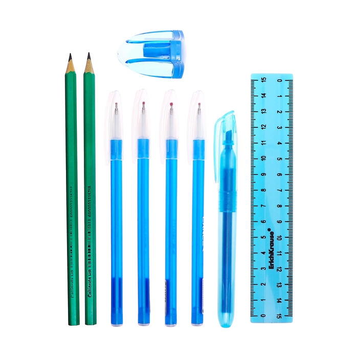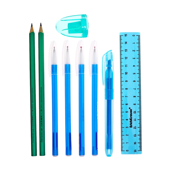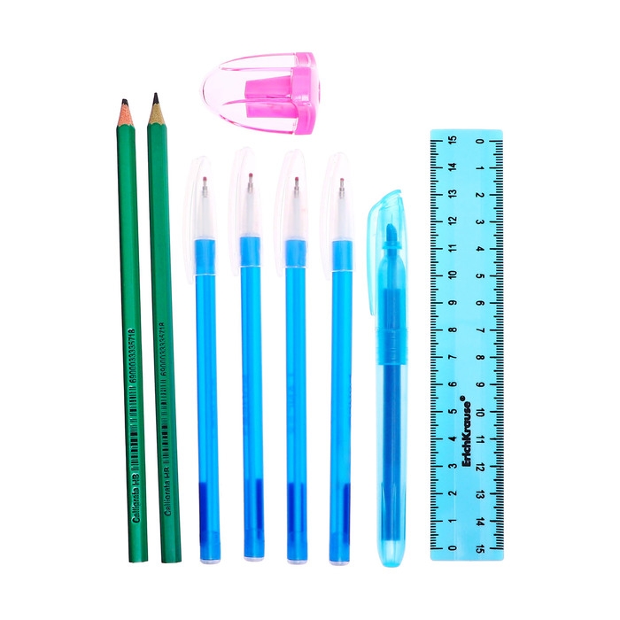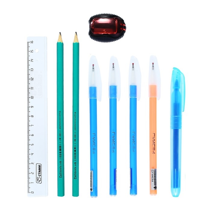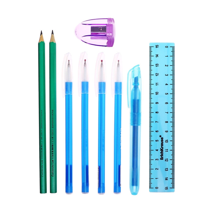 Поставляется с наполнением - 9 предметов ( 4 ручки, линейка, точилка, 2 карандаша, тектовыделитель).