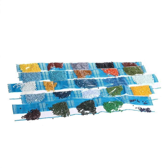 Разложите кристаллики с помощью карандаша по указанной схеме, заполнив всё полотно. На картине уже обозначены необходимые оттенки. Холст с клеевым покрытием будет надёжно удерживать стразы.