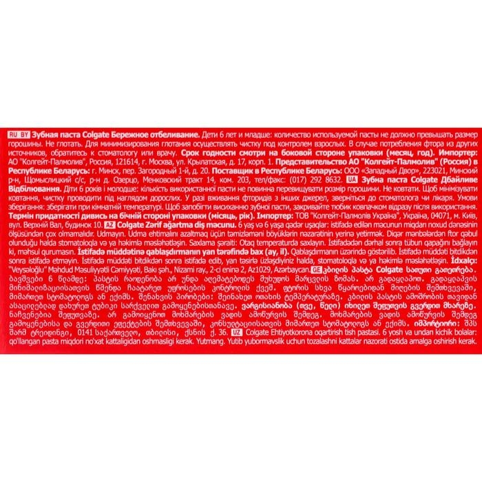 Со временем эмаль теряет свою естественную белизну. Зубная паста Colgate Бережное Отбеливание Бережно удаляет потемнения с поверхности зубов, восстанавливая их естественную белизну, и не повреждая зубную эмаль, а также укрепляет эмаль зубов и защищает от кариеса. Благодаря этому вы можете каждый день радовать себя и своих близких ослепительной улыбкой.