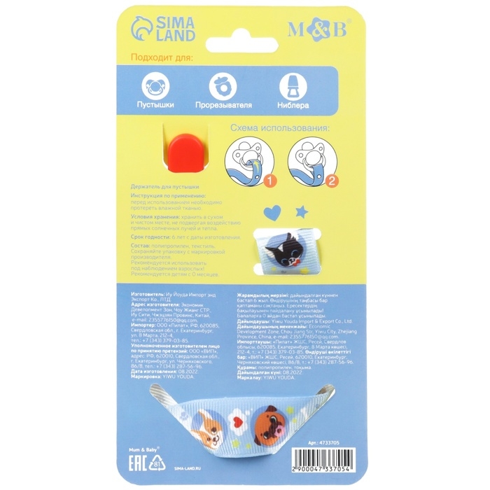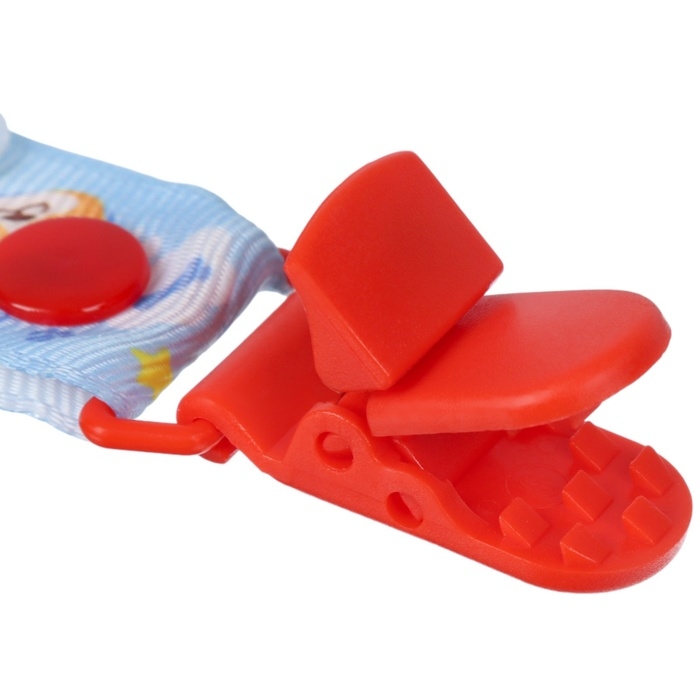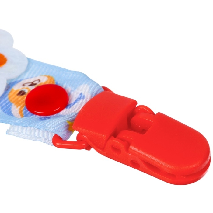 Изделие фиксируется на одежде ребёнка. На конце цепочки есть карабин, который зацепляется за кольцо пустышки. Надёжное крепление убережёт вещь от падения на пол, если малютка случайно выронит её изо рта.