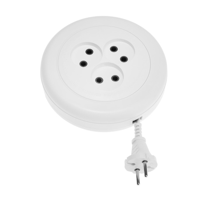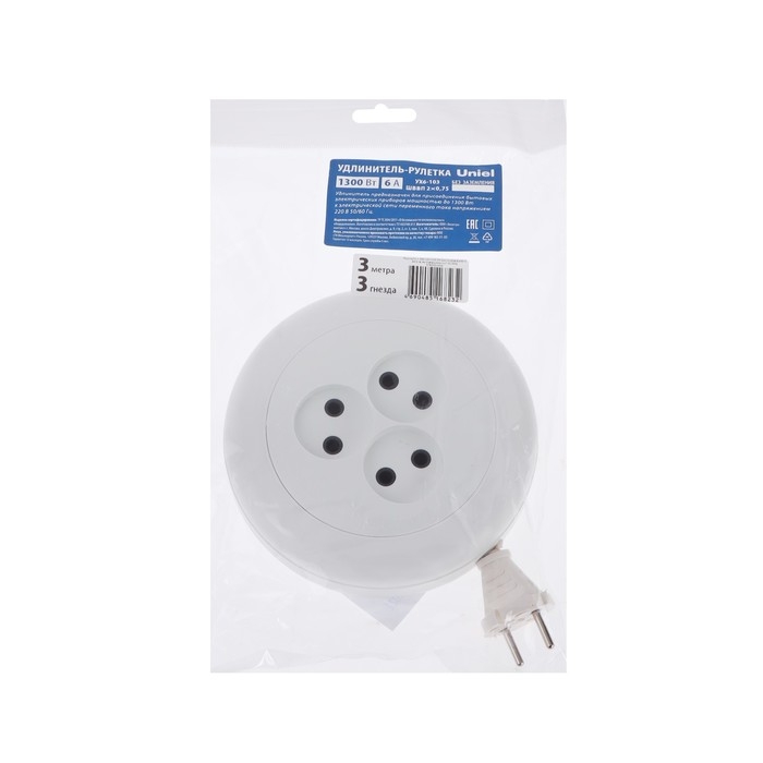 Удлинитель-рулетка Uniel, 3 розетки, 3 м, 6 А, 1300 Вт, ШВВП 2х0.75 мм2, без з/к, белый
