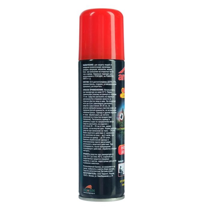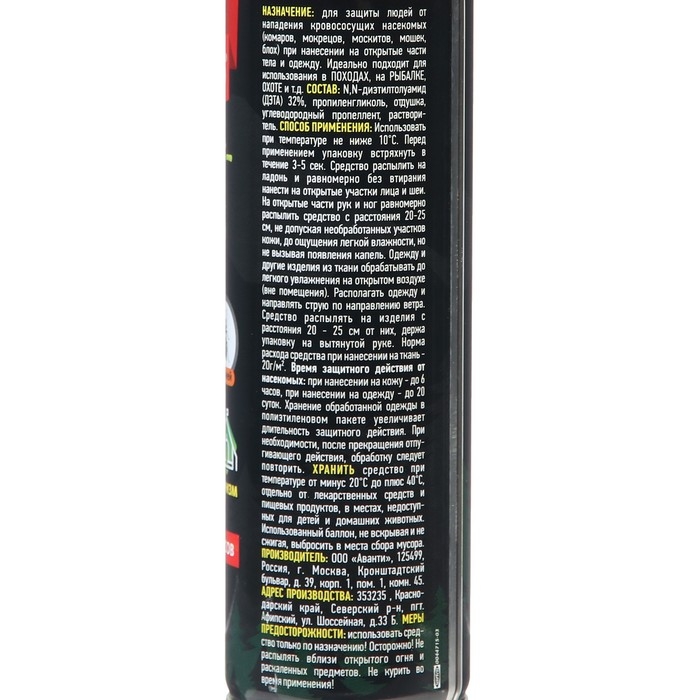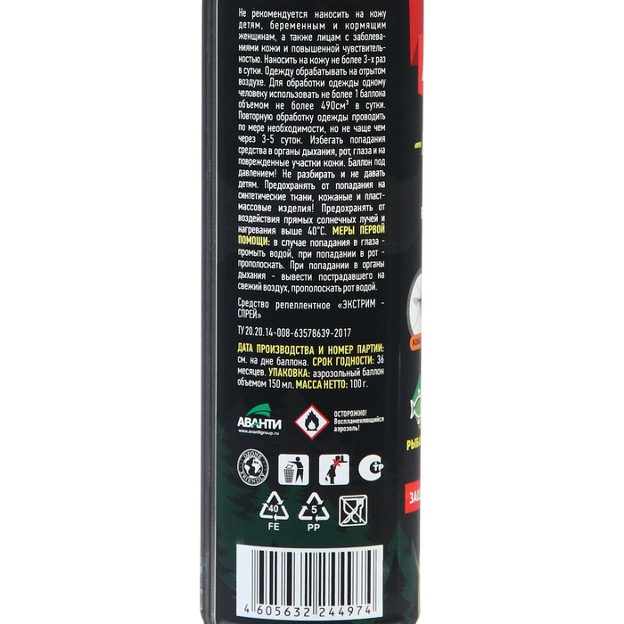 Описание:Для защиты людей от нападения кровососущих насекомых (комаров, мокрецов, москитов, мошки, слепней) при нанесении на открытые части тела. EXTREME АЭРОЗОЛЬ идеально подойдет для защиты от насекомых в экстримальных условиях: на рыбалке, охоте, отдыхе, в лесу, в тайге, в горах, в районах с повышенной влажностью.Способ применения:Средство тонким слоем без втирания нанести на открытые части тела - лицо, руки, ноги, шею. Время защитного действия от насекомых - до 6 часов. При необходимости обработку повторить. Действующие вещество: диэтилтолуамид (ДЭТА) - 32%