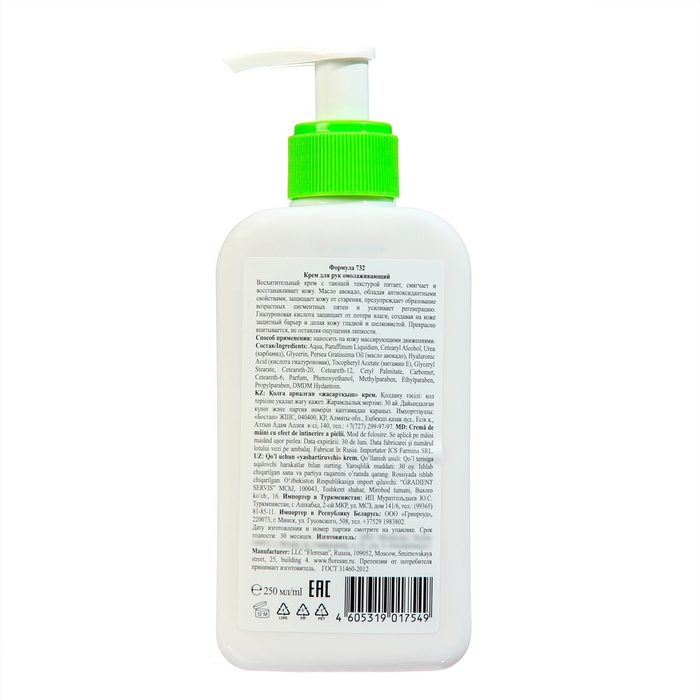 Состав: Aqua, Paraffinum Liquidum, Cetearyl Alcohol, Urea (карбамид), Glyceryl Stearate, Ceteareth-20, Ceteareth-12, Cetyl Palmitate, Glycerin, Cetrimonium Chloride, Hydrolyzed Silk (Шелк гидролизованный), Sodium Hyaluronate (Натрия гиалуронат), Tocopheryl Acetate (Витамин Е), Ceteareth-6, Parfum, Phenoxyethanol, Methylparaben, Ethylparaben, Propylparaben, DMDM Hydantoin.