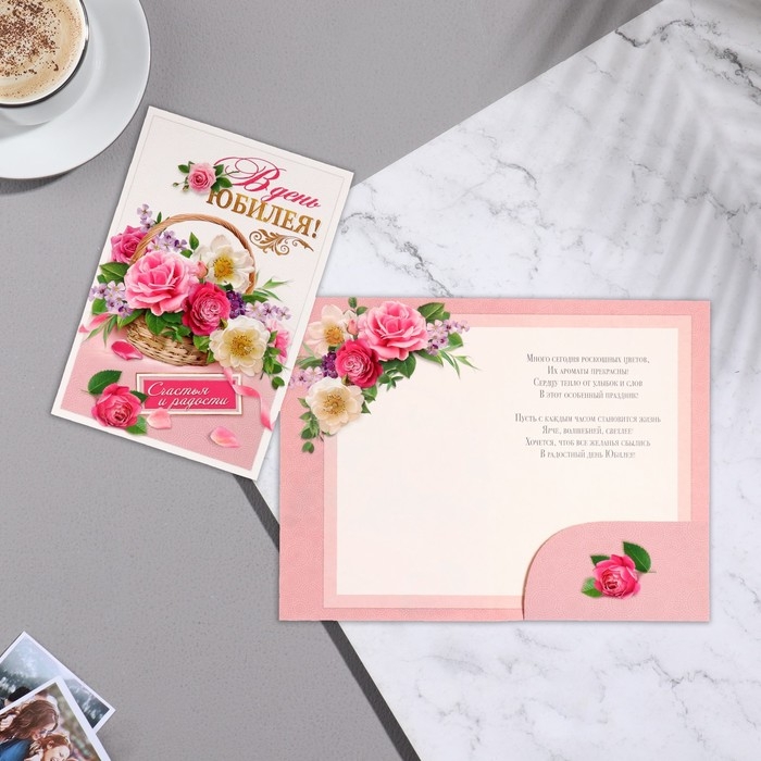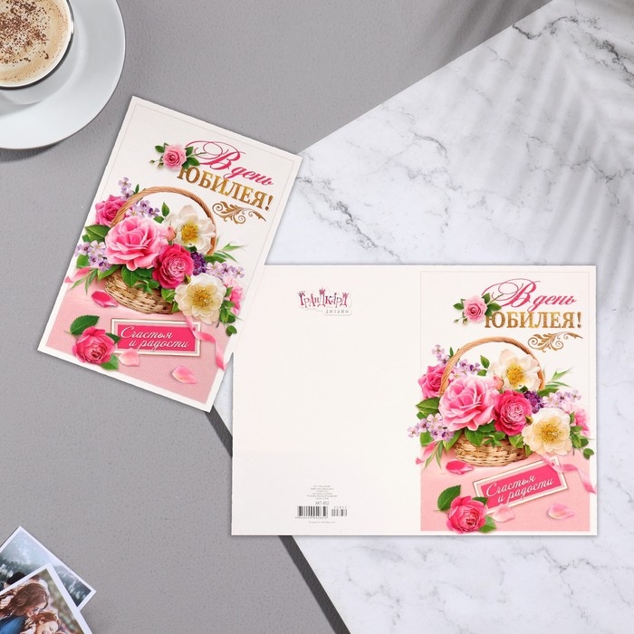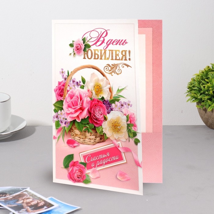Открытка "В День Юбилея!" тиснение, корзина, цветы, 29х19,5 см