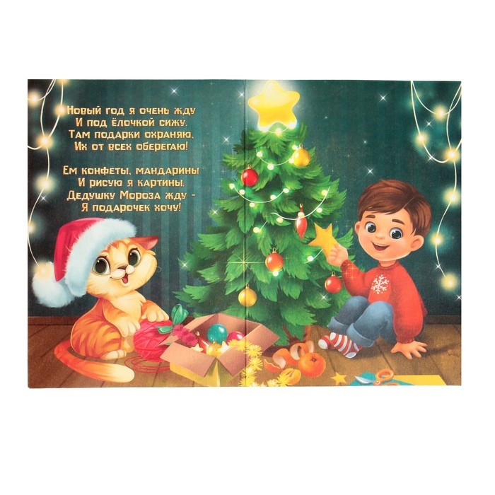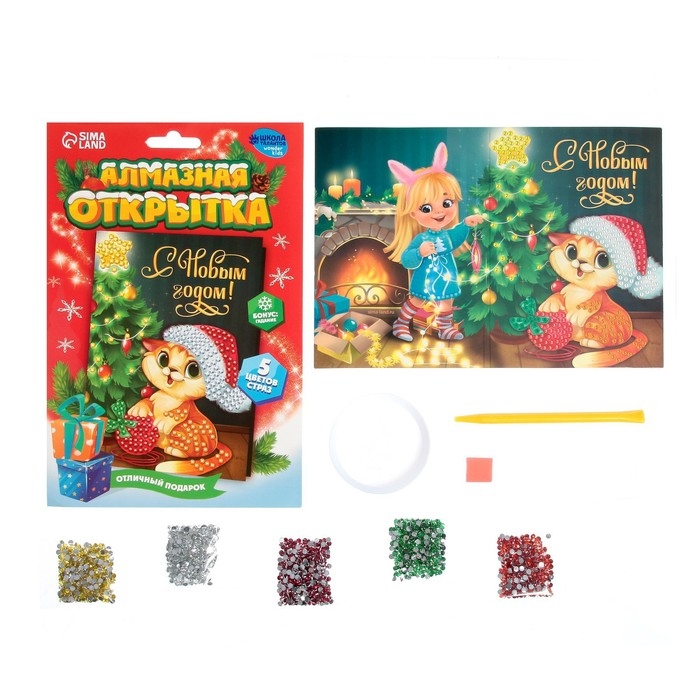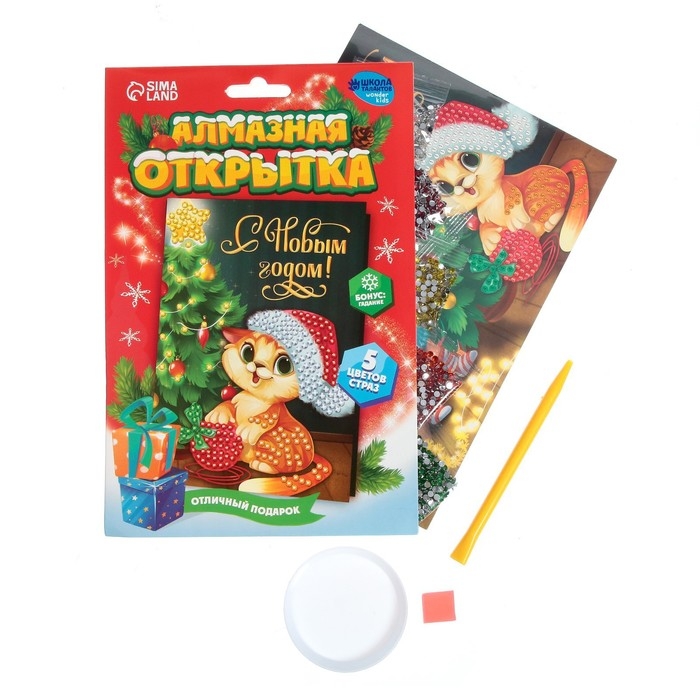 Алмазная мозаика на новый год с частичным заполнением для детей на открытке «Котик у ёлочки», А5, набор для творчества