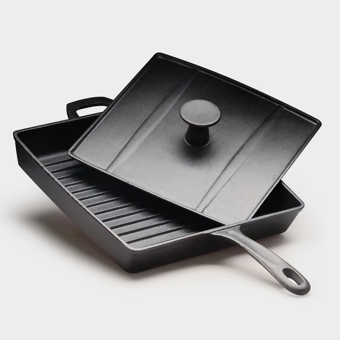 Сковорода рифленая чугунная с крышкой - прессом, 27×27 см