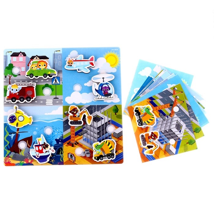 - В наборе вы найдёте 8 липучек с транспортом и 4 поля с разными локациями.