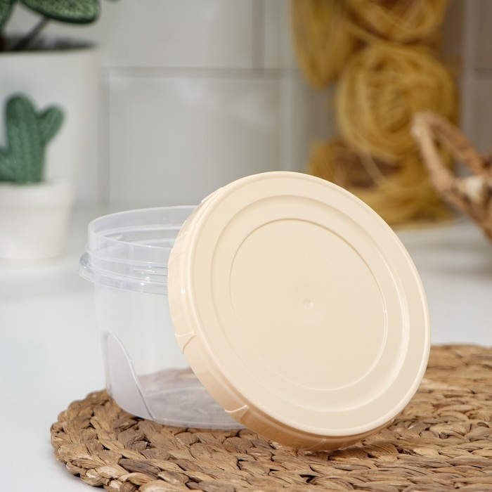 Банка для сыпучих продуктов изготовлена из пластика. Имеет плотно закрывающуюся крышку, которая защищает еду от влаги и посторонних запахов. В ёмкости удобно хранить крупы, специи, макаронные изделия, сахар, муку и бобовые.