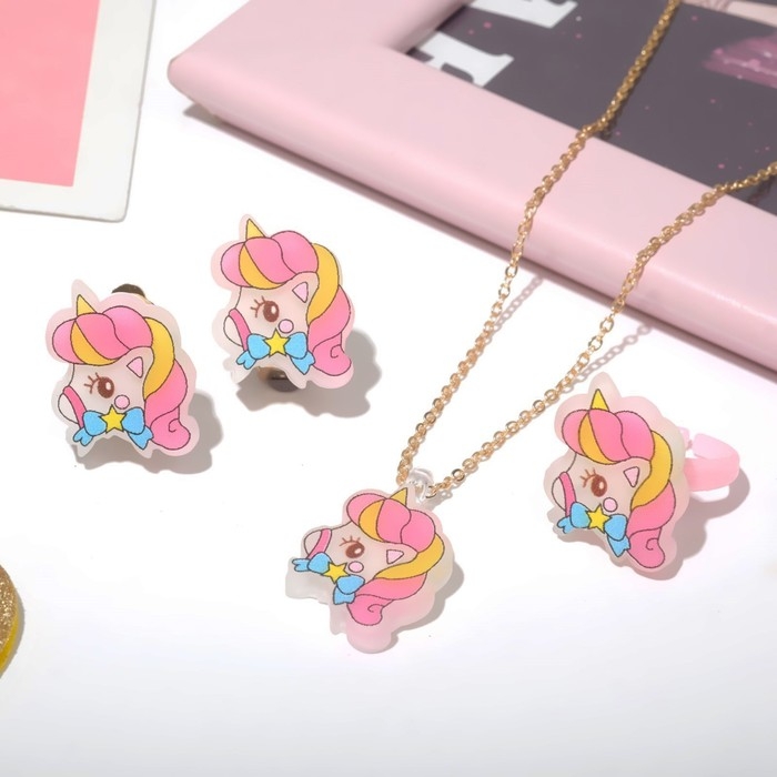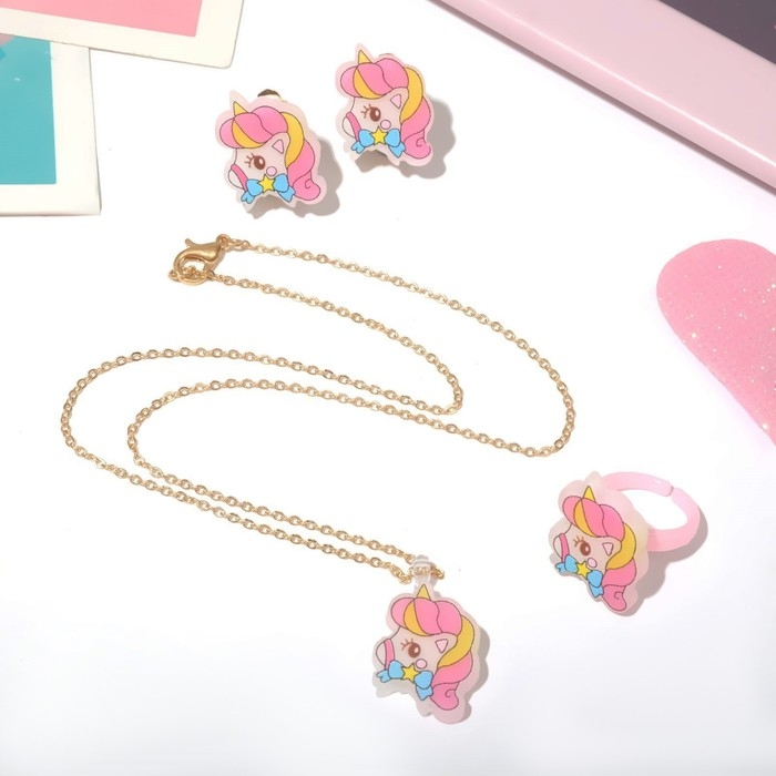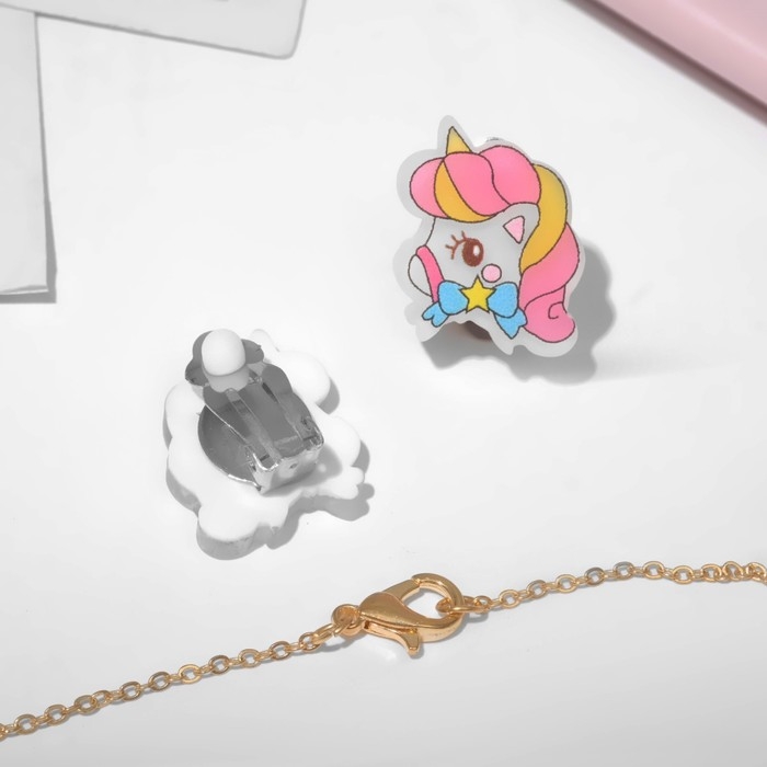 Набор детский «Выбражулька» 3 предмета клипсы, кулон, кольцо, единорожка, цветной в золоте