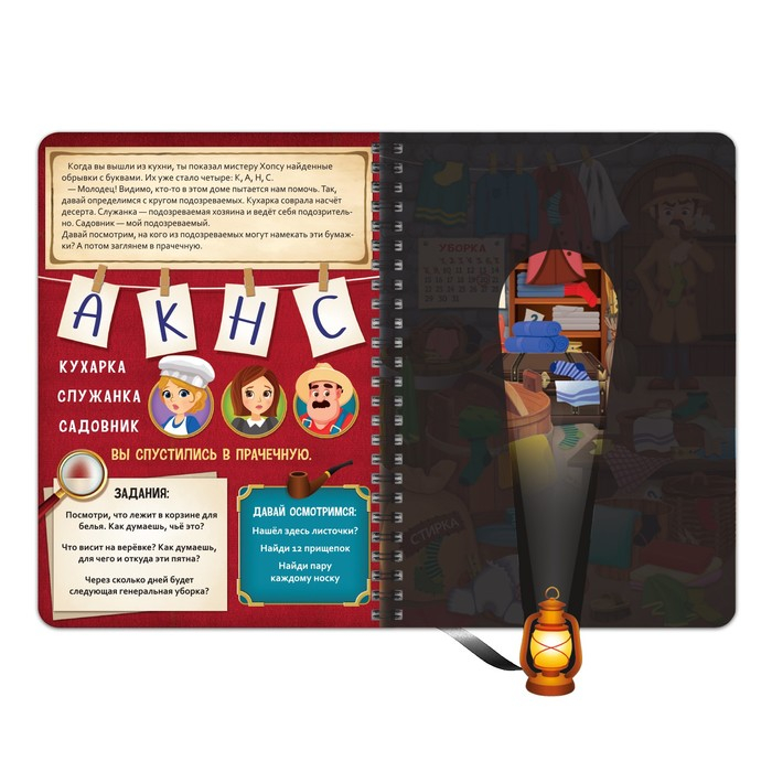 Чтобы отыскать спрятанные вещи, вам понадобится фонарик. Он выполнен из картона и привязан к книжке на шнурок.