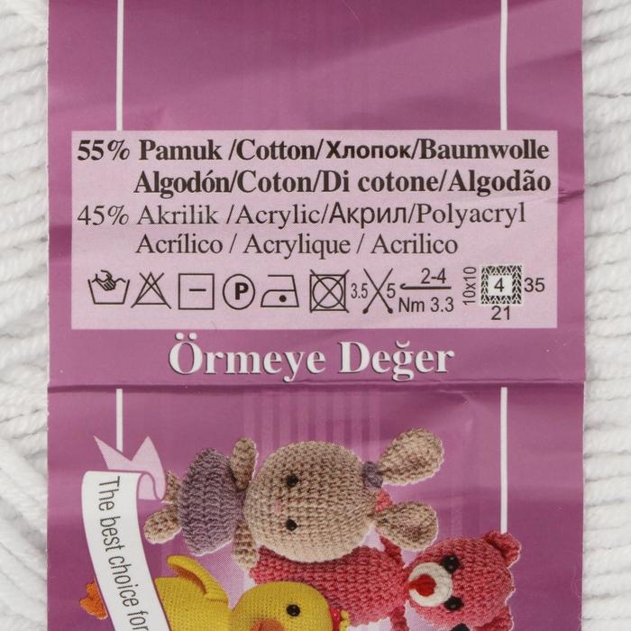 Турецкая пряжа "Cotton Gold" 55% хлопок, 45% акрил, 330м/100гр (55 белый) мягкая и бархатистая на ощупь, незаменима в летний и демисезонный периоды. Ниточка довольно плотная, вяжется легко, петельки ложатся ровно и аккуратно. Кроме того, готовое полотно хорошо держит форму, поэтому даже ажурные узоры для неё не предел.