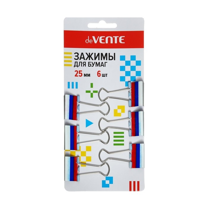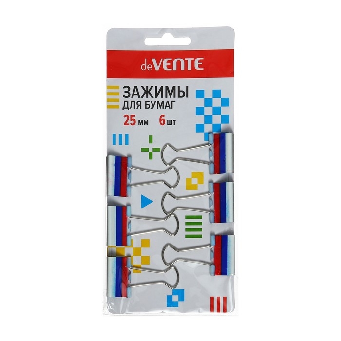 Зажим для бумаг "deVENTE. Триколор" металлический (25 мм) толщина скрепления до 10,5 мм, 6 шт на картонном блистере.