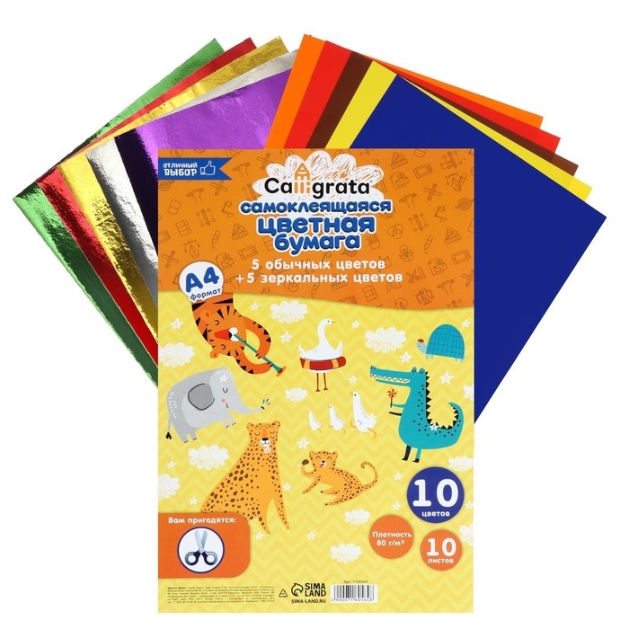 Бумага цветная самоклеящаяся А4, 10 листов, 10 цветов (5 обычных + 5 зеркальных), 80 г/м2