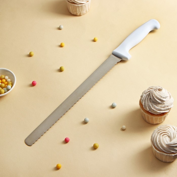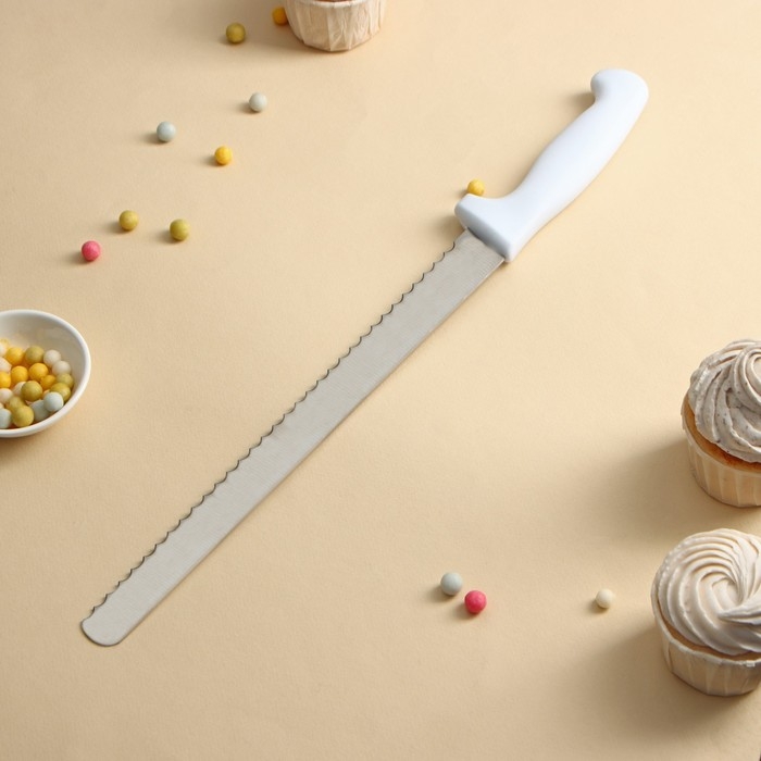 Нож для бисквита, мелкие зубчики, ручка пластик, рабочая поверхность 29,5 см, толщина лезвия 1,9 мм, цвет белый