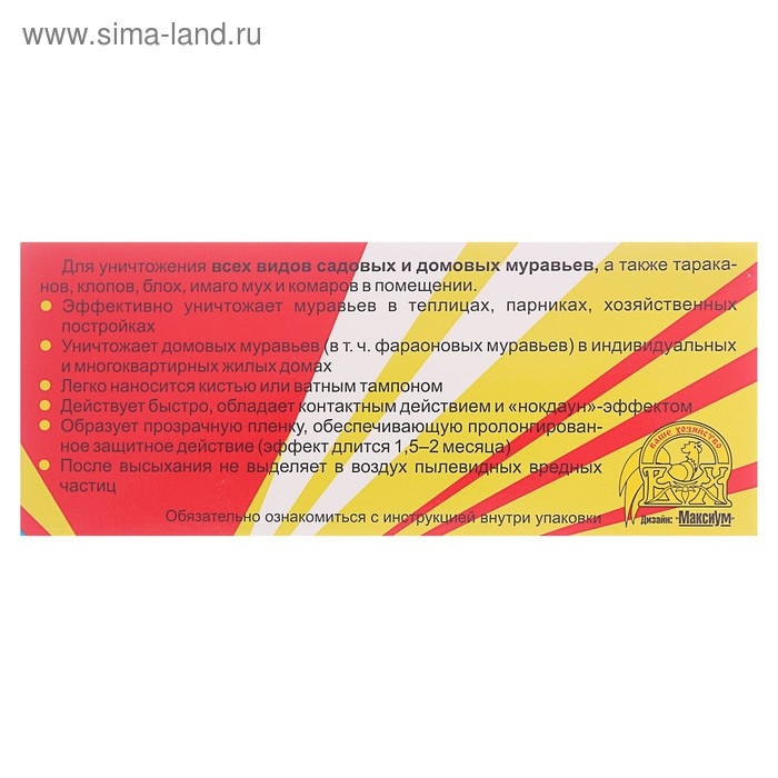 Эффективно уничтожает муравьев в теплицах, парниках, хозяйственных постройках. Уничтожает домовых муравьев (в т. ч. фараоновых муравьев) в индивидуальных и многоквартирных жилых домах.