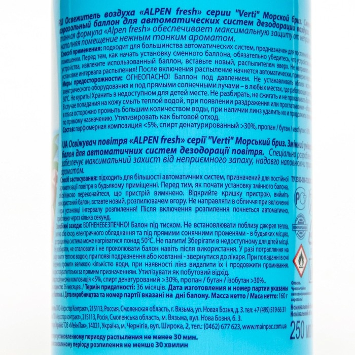 Сменный баллон для автоматического освежителя Alpen, Морской бриз, 250 мл