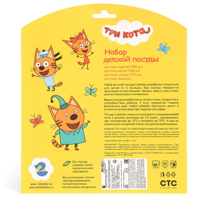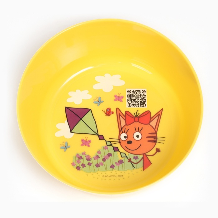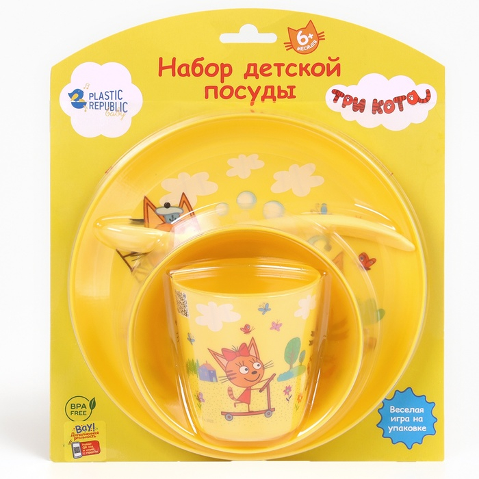 Посуда разработана специально для детей от 6 месяцев и будет удобна как для кормления, так и для освоения малышом навыков самостоятельного приема пищи. Любимые герои сериала "ТРИ КОТА" на дне тарелочек порадуют малыша и послужат стимулом съесть всю порцию. Для производства детской посуды используются исключительно безопасные нетоксичные материалы. Изделие выполнено из прочного пластика, тарелочка не разобьется при падении. Рисунок надежно вплавлен в поверхность и устойчив к чистящим средствам. Можно мыть в посудомоечной машине, разогревать в микроволновой печи и ставить в холодильник. Посуда не содержит бисфенол-А (BPA 0%).