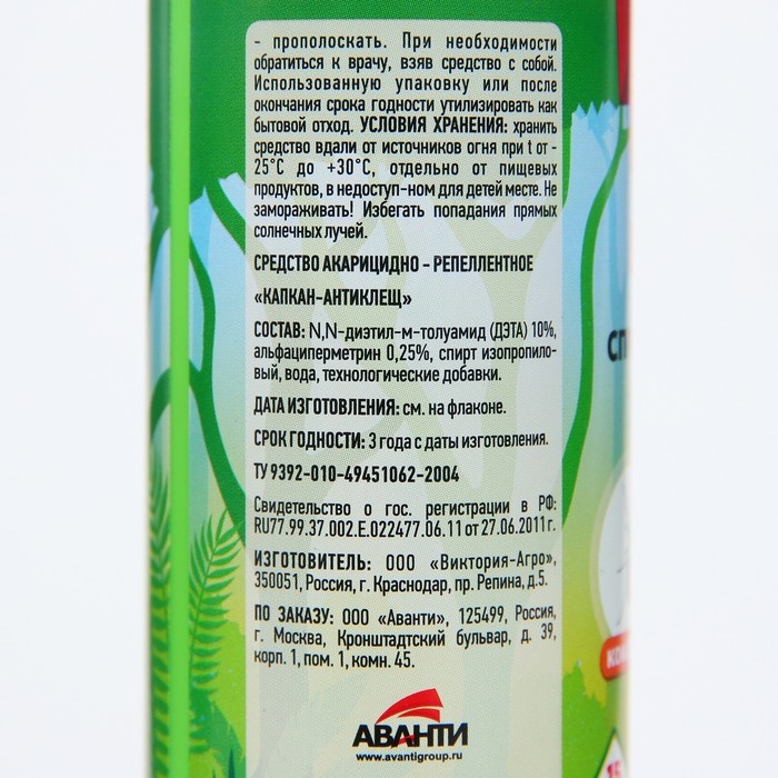 Описание:Спрей универсальный ARGUS предназанчен для защиты людей от кровососущих насекомых - комаров, клещей, мокрецов, москитов, мошек - при обработке одежды, занавесей, пртивомоскитных сеток и другого снаряжения из ткани.Применение:Разложить или развесить одежду для обработки на воздухе или в проветриваемом помещении. Расположить одежду и направить струю по направлению ветра. Средство распылять на изделие с расстояния 20 - 25 см от них, держа упаковку на вытянутой руке, из расчета 1 нажим на распылительную головку на участок 10 х 10 см. Особенно тщательно обработать брюки вокруг щиколоток, голеней, коленей, бедер и места возможного проникновения клещей к телу. Одежду просушить (не менее 2 часов) и надевать на нижнее белье. Повторную обработку одежды проводить через 10 - 15 суток или после стирки. Не обрабатывать одежду на человеке и не надевать ее до полного высыхания. Не обрабатывать кожу.Время защитного действия от клещей - до 15 суток, при условии хранения обработанной одежды в закрытом полиэтиленовом пакете.Действующее вещество: диэтилтоуламид 10 %,альфациперметрин 0,25%.