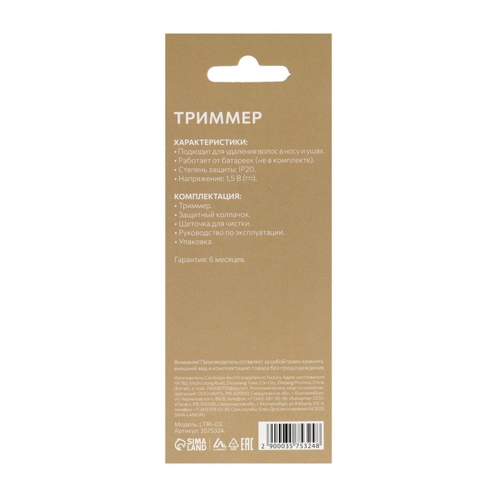 Триммер для волос Luazon LTRI-02, для носа/ушей, АКБ, золотистый