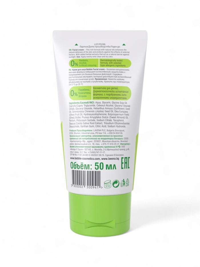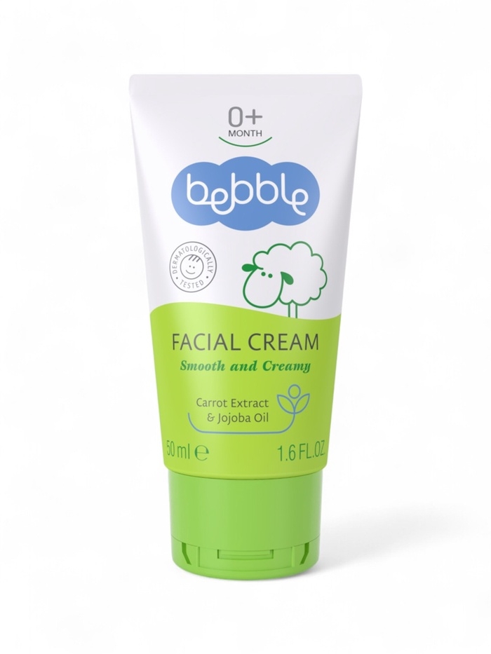 Крем для лица Bebble богат натуральными маслами, имеет мягкую текстуру и активную защитную формулу. Крем питает, смягчает и защищает деликатную кожу малыша от воздействия внешних факторов. Входящий в состав экстракт моркови действует как природный антиоксидант, улучшает регенерацию клеток и образует натуральный барьер для солнечных лучей.