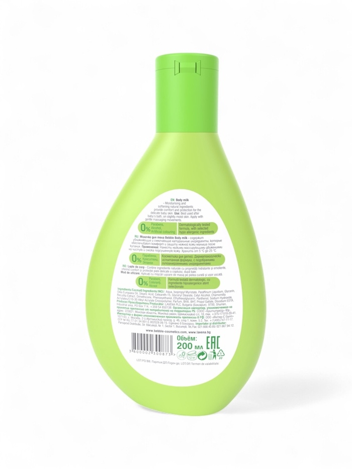 Насладитесь ощущением нежного прикосновения к коже малыша, которую питает и защищает молочко для тела Bebble. Молочнообразная формула активно питает кожу и помогает сохранить ее естественный уровень увлажненности. Гладкая эмульсия с пантенолом успокаивает и защищает кожу, а комбинация натуральных масел заботится о ней, сохраняя ее мягкость.