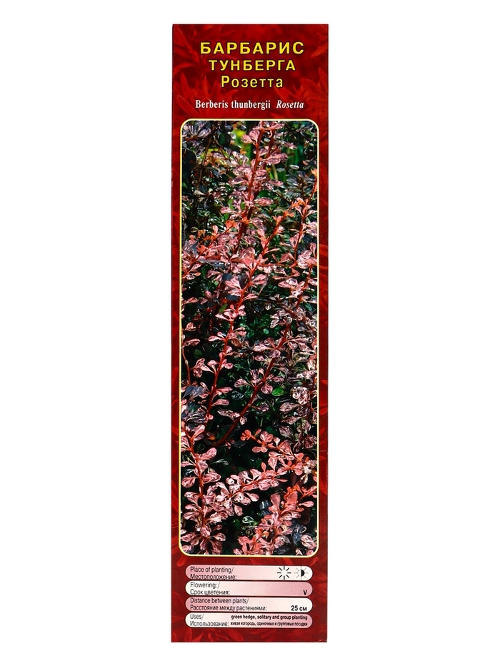 Саженцы барбариса "Розетта" вырастают шаровидным кустарником около 40-60 сантиметров в высоту. Ветви изогнуты вниз, изящные, тоненькие и покрыты небольшими, острыми колючками. Листва небольшая, цельнокроеная. Молодые листики имеют ярко-пурпурный тон с розовато-серыми разводами, а взрослые листики темно-розового тона с сероватыми пятнами. Цветет желтыми цветочками, которые собраны в небольшие кисти.