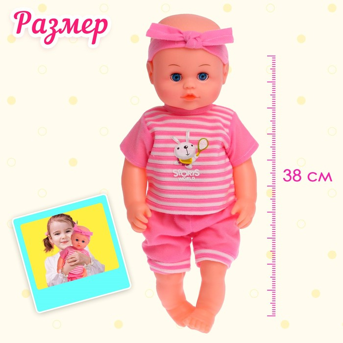 Высота куклы: 38 cм. Пупс интерактивный. Смеётся, чмокает, зевает, целует, кашляет, чихает, плачет. Говорит «агу», «папа», «мама». В комплекте 3 батарейки типа LR44 (V13GA, AG13, LR1154).