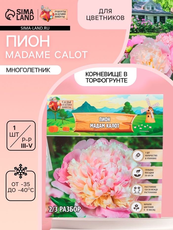 Пион травянистый сорта Мадам Калот (Madame Calot) - многолетник с мощными мясистыми корнеклубнями. Высота растения до 100 см. Цветки (до 13 см) махровые, белые с кремовым оттенков по краям лепестков и более темным оттенком розового в центре бутона. Обладает очень сильным ароматом. Листья крупные рассеченные. Срок цветения - средне-ранний.Аромат: Сильный; ярко выраженныйВид упаковки: перфорированный пакет с субстратомВремя посадки: Март — Июнь; Июль — НоябрьВремя цветения: Май — ИюньМестоположение: полутень; солнцеМорозостойкость: минус 35°СР-р посад. материала: 3 — 4 почки