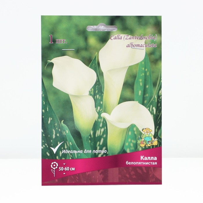 Калла - многолетнее травянистое растение с клубневидным корневищем. Листья крупные, стреловидной формы, блестящие, восковые. Соцветие одиночное на длинном цветоносе в виде кремово-желтого початка в обрамлении воронковидного, слегка волнистого покрывала. Окраска разнообразная: белая, желтая, розовая, карминная, лиловая. Месторасположение: хорошо прогреваемый солнечный участок с небольшим затенением или подоконник с рассеянным освещением.Почва: питательная, легкая, хорошо дренированная.Посадка: рано весной в горшки для комнатной культуры, в открытый грунт - после того, как минует угроза заморозков. Клубни сажают на глубину 5-10 см и хорошо проливают почву, поскольку каллы любят влагу.Уход: обильные поливы весной и летом, особенно в жаркие дни, осенью каллам хватает естественной влаги. Подкормки производят 1 раз в 2 недели минеральными и органическими удобрениями. В открытом грунте каллы не зимуют. Клубни выкапывают вместе с надземной частью в середине-конце сентября до того, как установятся отрицательные температуры. В таком виде оставляют на просушку в течение 1-2 недель. Когда листья будут легко отделяться от клубнекорня, подсушивание можно прекращать. Очищенные от надземной части, клубни калл перекладывают в бумажные пакеты и хранят в сухом месте при температуре +5…+15 0С до следующей посадки.Использование: каллы успешно выращивают на подоконнике, получая оригинальную, изящную срезку. Красиво смотрятся в центре клумбы, эффектно сочетаясь с лилиями, хостами. Растение служит прекрасным украшением больших аквариумов, искусственных водоемов, фонтанов. Белопятнистая - Высота растения 50-60 см, цвет белый. Листья с симпатичным белым крапом.