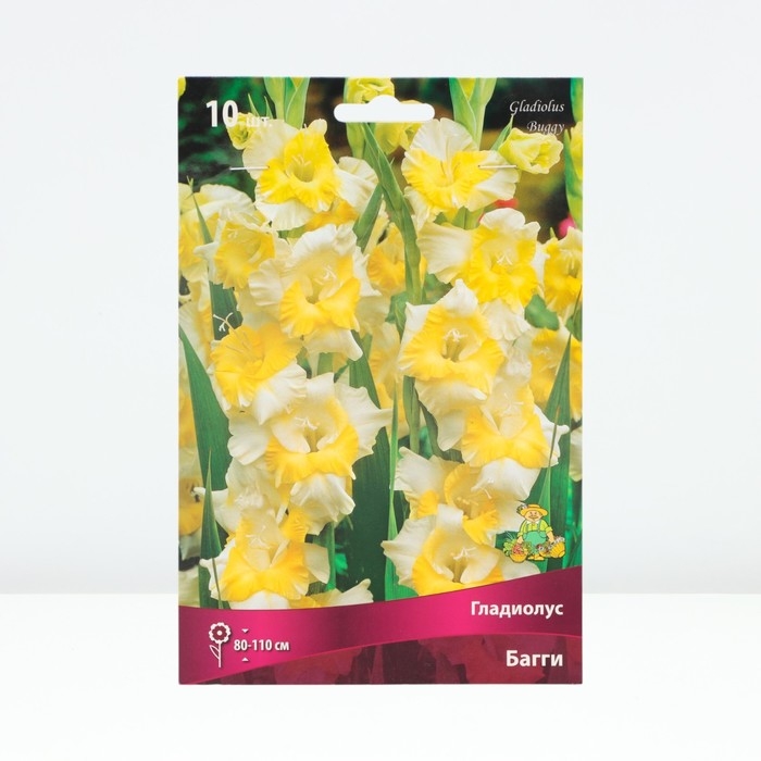 Гладиолус – клубнелуковичное растение высотой 50-150 см с вертикальным стеблем и линейными или мечевидными листьями. Цветки воронковидные, собраны в колосовидное соцветие до 80 см длиной, самых разнообразных окрасок, могут быть простыми или гофрированными.Месторасположение: хорошо освещенные, защищенные от ветра участки.Почва: суглинистые или супесчаные, достаточно дренированные со слабокислой реакцией.Посадка: луковицы высаживают, когда почва на глубине 10-12 см прогреется до температуры 8…10 0С. Слой почвы над взрослой луковицей должен быть около 8-10 см. Мелкие клубнелуковицы высаживают через 5-10 см друг от друга, крупные – через 10-15 см.Уход: всходы желательно замульчировать торфом слоем 2-3 см. В течение лета растениям необходимо обеспечить регулярный полив, рыхление и 2-3 подкормки минеральными удобрениями. Срезку лучше проводить утром или вечером. В открытом грунте растение не зимует. Луковицы выкапывают осенью до наступления устойчивых холодов, просушивают и хранят в сухом прохладном месте.Использование: для посадки в цветники и клумбы. Идеальны для срезки. Багги - высота растения 80-110 см. Цветок двухцветный: центральные лепестки желтые, нижние - белые.