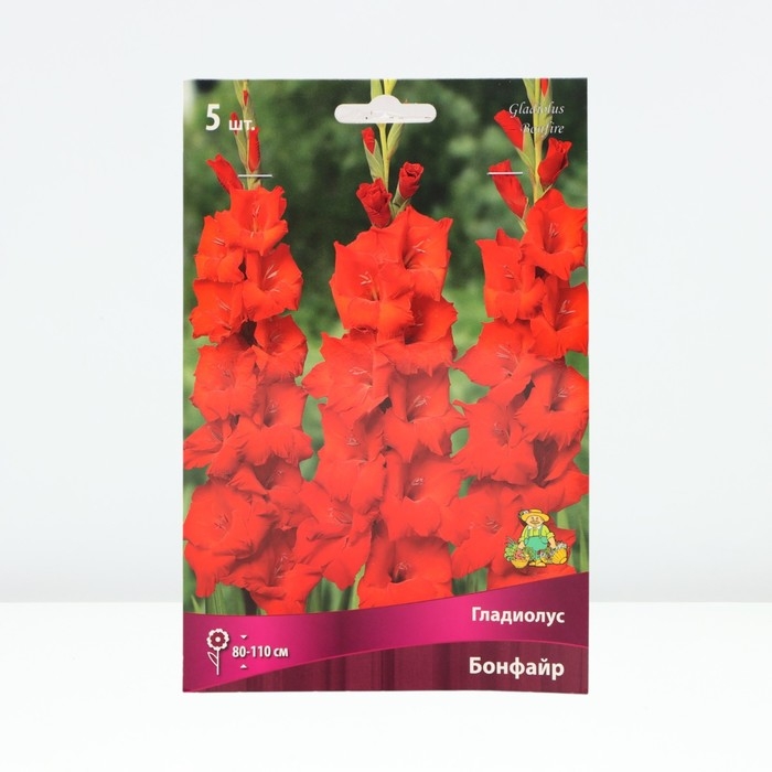 Гладиолус – клубнелуковичное растение высотой 50-150 см с вертикальным стеблем и линейными или мечевидными листьями. Цветки воронковидные, собраны в колосовидное соцветие до 80 см длиной, самых разнообразных окрасок, могут быть простыми или гофрированными.Месторасположение: хорошо освещенные, защищенные от ветра участки.Почва: суглинистые или супесчаные, достаточно дренированные со слабокислой реакцией.Посадка: луковицы высаживают, когда почва на глубине 10-12 см прогреется до температуры 8…10 0С. Слой почвы над взрослой луковицей должен быть около 8-10 см. Мелкие клубнелуковицы высаживают через 5-10 см друг от друга, крупные – через 10-15 см.Уход: всходы желательно замульчировать торфом слоем 2-3 см. В течение лета растениям необходимо обеспечить регулярный полив, рыхление и 2-3 подкормки минеральными удобрениями. Срезку лучше проводить утром или вечером. В открытом грунте растение не зимует. Луковицы выкапывают осенью до наступления устойчивых холодов, просушивают и хранят в сухом прохладном месте.Использование: для посадки в цветники и клумбы. Идеальны для срезки. Бонфайр - высота растения 80-110 см. Лепестки цвета пламени: сочетание красных и оранжевых оттенков.