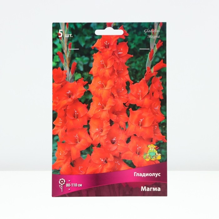 Гладиолус – клубнелуковичное растение высотой 50-150 см с вертикальным стеблем и линейными или мечевидными листьями. Цветки воронковидные, собраны в колосовидное соцветие до 80 см длиной, самых разнообразных окрасок, могут быть простыми или гофрированными.Месторасположение: хорошо освещенные, защищенные от ветра участки.Почва: суглинистые или супесчаные, достаточно дренированные со слабокислой реакцией.Посадка: луковицы высаживают, когда почва на глубине 10-12 см прогреется до температуры 8…10 0С. Слой почвы над взрослой луковицей должен быть около 8-10 см. Мелкие клубнелуковицы высаживают через 5-10 см друг от друга, крупные – через 10-15 см.Уход: всходы желательно замульчировать торфом слоем 2-3 см. В течение лета растениям необходимо обеспечить регулярный полив, рыхление и 2-3 подкормки минеральными удобрениями. Срезку лучше проводить утром или вечером. В открытом грунте растение не зимует. Луковицы выкапывают осенью до наступления устойчивых холодов, просушивают и хранят в сухом прохладном месте.Использование: для посадки в цветники и клумбы. Идеальны для срезки. Магма - высота растения 80-110 см. Цветок ярко-красный.
