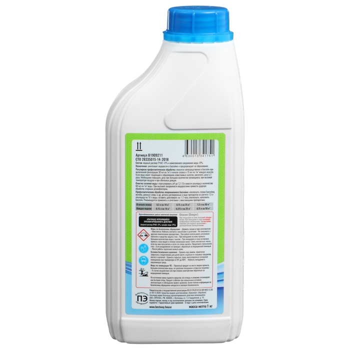 Для профилактической обработки опорожнённого бассейна нужно ополоснуть стенки бассейна, желоба, донные сливы и другие детали растворённым в воде препаратом из расчёта 1,5 л альгицида на 10 л воды, оставить действовать на 1–2 часа, ополоснуть и наполнить бассейн.